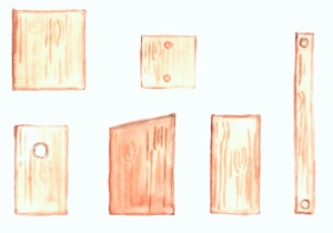 Wenn der Nistkasten lange schön bleiben soll, kann man die Einzelteile, bevor sie zusammen genagelt werden mit Holzschutzmittel streichen. Man darf ihn dann allerdings erst aufhängen, wenn er getrocknet ist und nicht mehr nach der Farbe stinkt. Man malt also die Maße und Umrisse wie in der angegebenen Bastelanleitung mit einem Bleistift auf das Holz und sägt alle Teile an der Linie entlang aus.